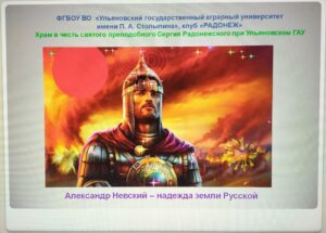 Накануне праздника святого благоверного великого князя Александра Невского 11 сентября 2023 года в Ульяновском государственном аграрном университете имени П. А. Столыпина на кураторском часе в 2-х группах со студентами проведена беседа на тему: «Александр Невский – надежда Земли русской». Организаторами выступили члены духовно-патриотического клуба «Радонеж»: руководитель профессор Светлана Дежаткина; кураторы групп — доценты Наталья Шаронина, Наталья Проворова и Елена Савина, старший преподаватель Светлана Иванова.