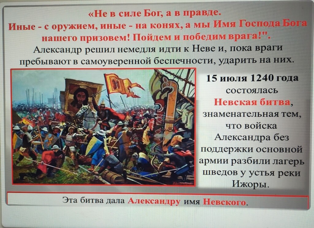 В ходе беседы ребята узнали, что святой благоверный князь Александр Невский не просто герой, не просто великий правитель — это символ России, вся его жизнь наполнена и страданием, и радостью, духовными и земными победами, служению своему народу. Студенты задавали вопросы, члены клуба отвечали и делились своим духовным опытом. Мероприятие вызвало живой интерес среди учащихся, многие из которых высказались за продолжение цикла бесед о русских святых.