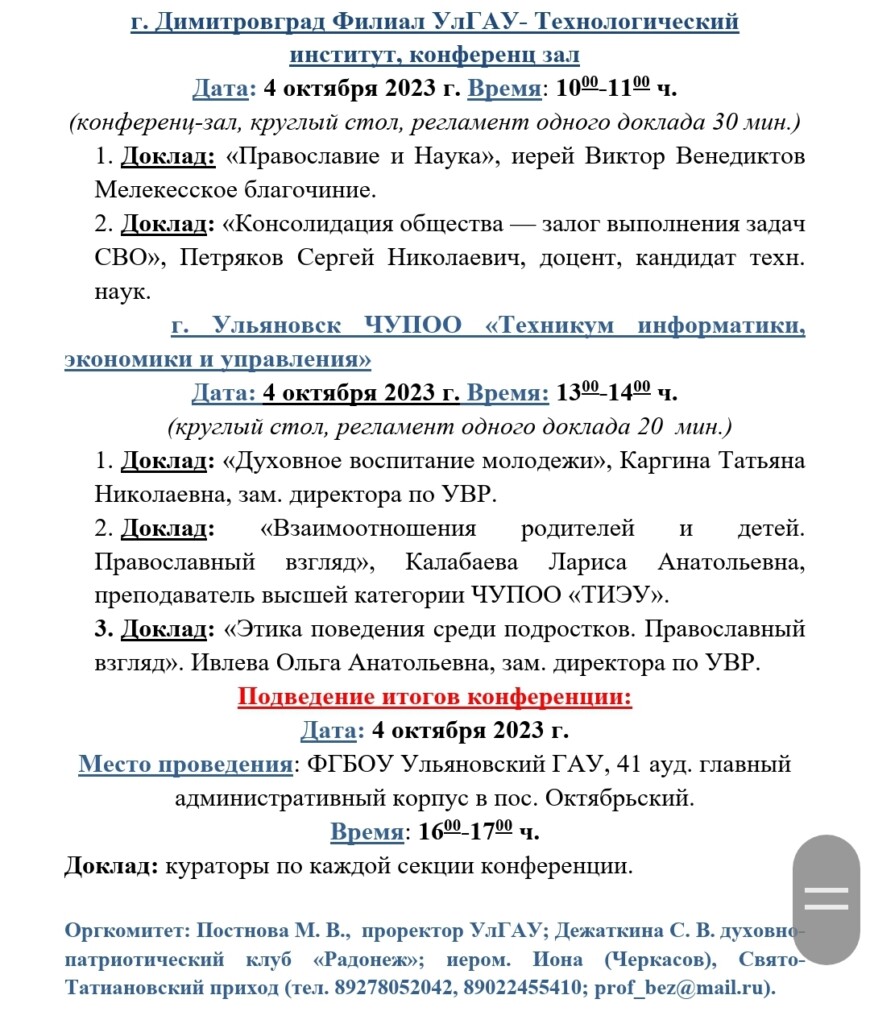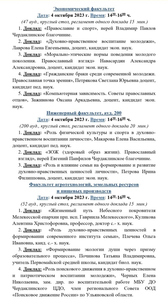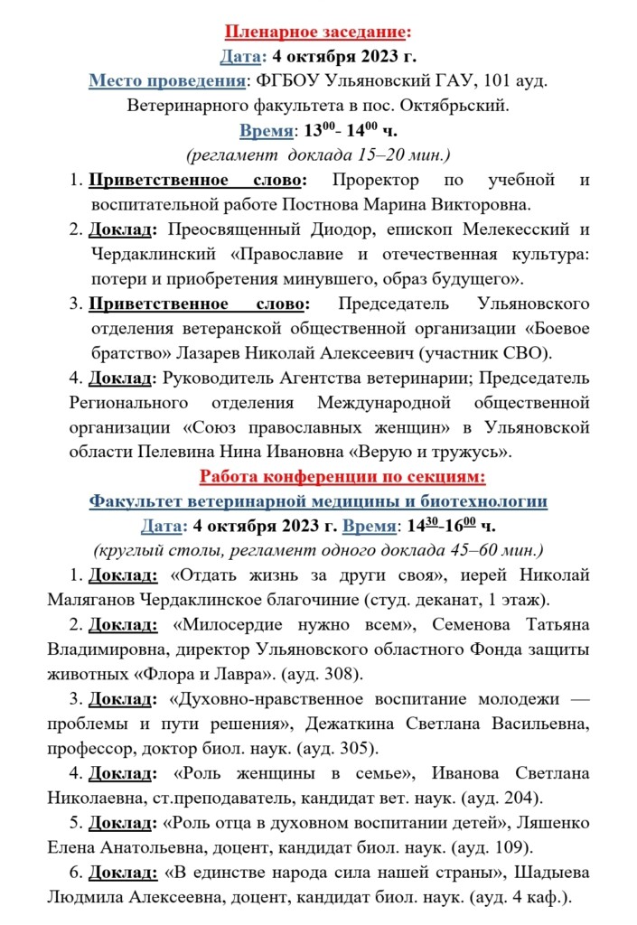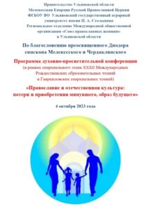 По благословению Преосвященного Диодора, епископа Мелекесского и Чердаклинского, 4 октября 2023 года в Ульяновском государственном аграрном университете имени П. А. Столыпина, в рамках епархиального этапа XXXII Международных Рождественских образовательных чтений и Гаврииловских епархиальных чтений, пройдет духовно-просветительная конференция «Православие и отечественная культура: потери и приобретения минувшего, образ будущего».